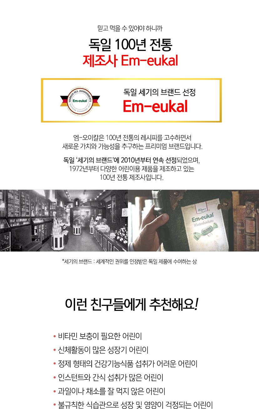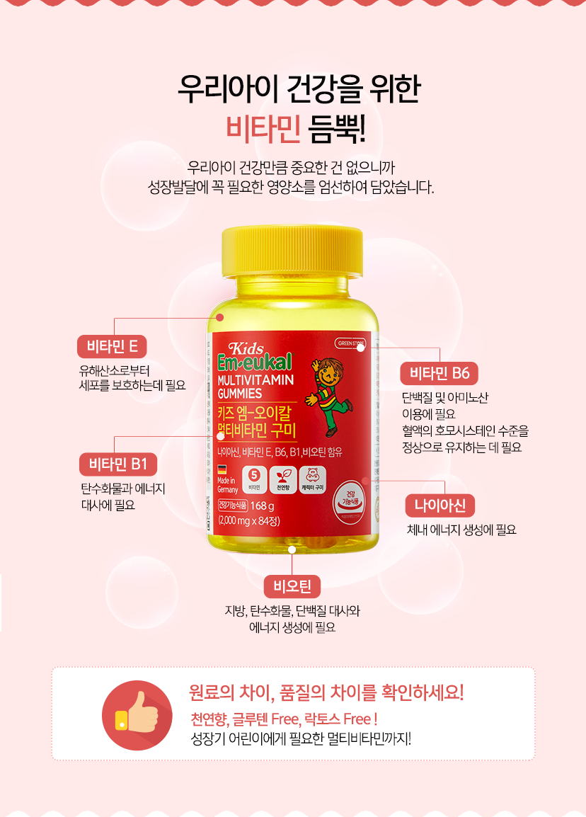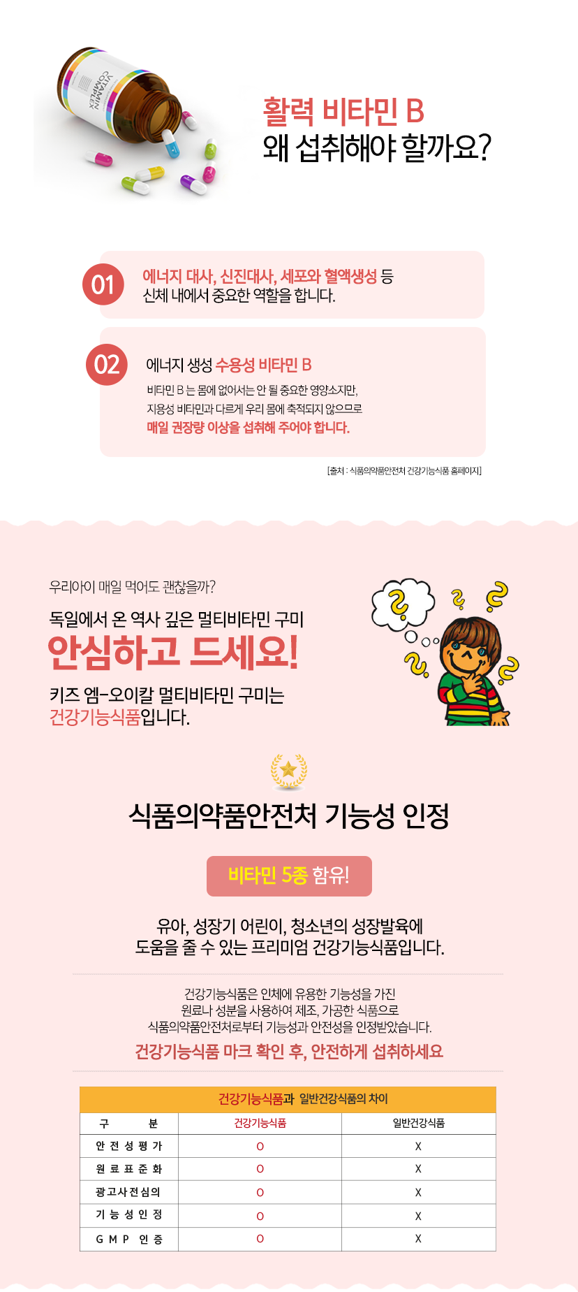 | 원료명 및 함량 | 비타민(니코틴산아미드, 비타민 E, 비타민 B6 염산염, 비타민 B1 염산염, 비오틴), 설탕, 포도당 시럽, 정제수, 젤라틴(돼지), 구연산, 천연향료(라즈베리향, 만다린향, 레몬향), 사과쥬스농축액, 밀납, 카나우바왁스, 코코넛오일, 유채유, 블랙커런트농축액, 당근농축액, 호박농축액, 사과농축액 [돼지고기 함유] |
