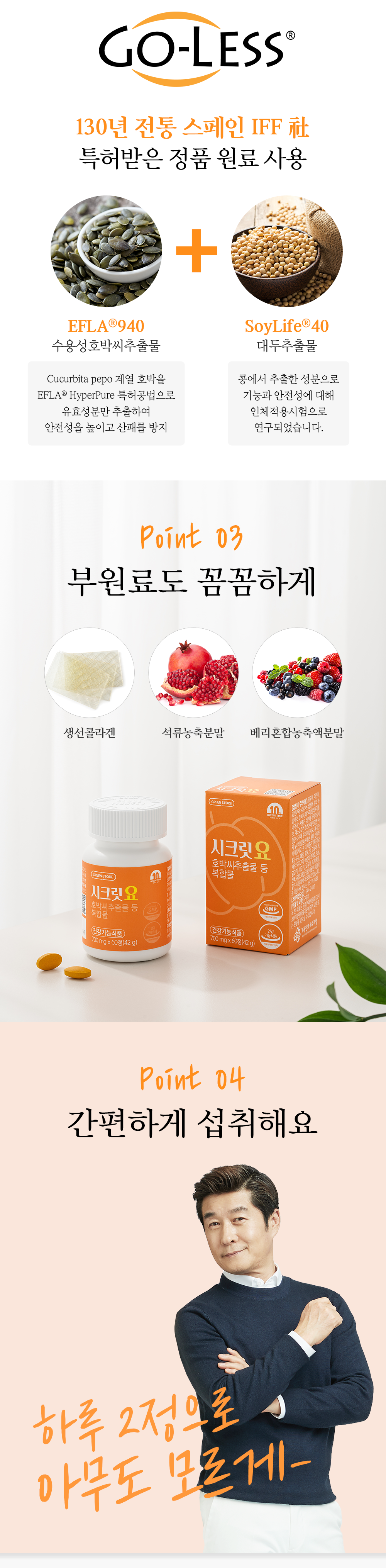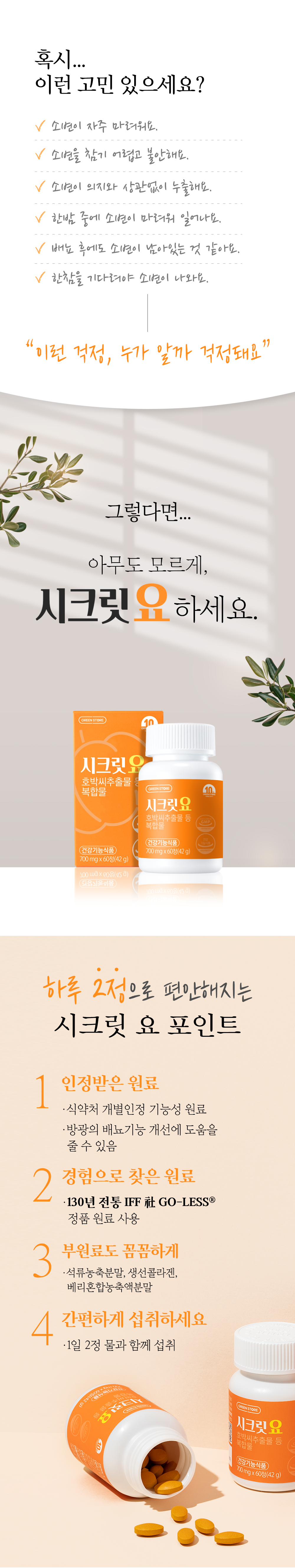 | 섭취 시 주의사항 및 부작용 발생 가능성 | 1일 1회, 1회 2정을 충분한 물과 함께 섭취하십시오. / 1일 1회, 1회 2정을 충분한 물과 함께 섭취하십시오.영유아, 어린이, 임산부와 수유부는 섭취에 주의 하십시오. 호박씨, 대두에 알레르기를 나타내는 사람은 섭취에 주의하십시오. 에스트로겐 호르몬에 민감한 사람은 섭취에 주의하십시오. 용기안의 실리카겔(방습제)은 절대 섭취하지 마십시오. |