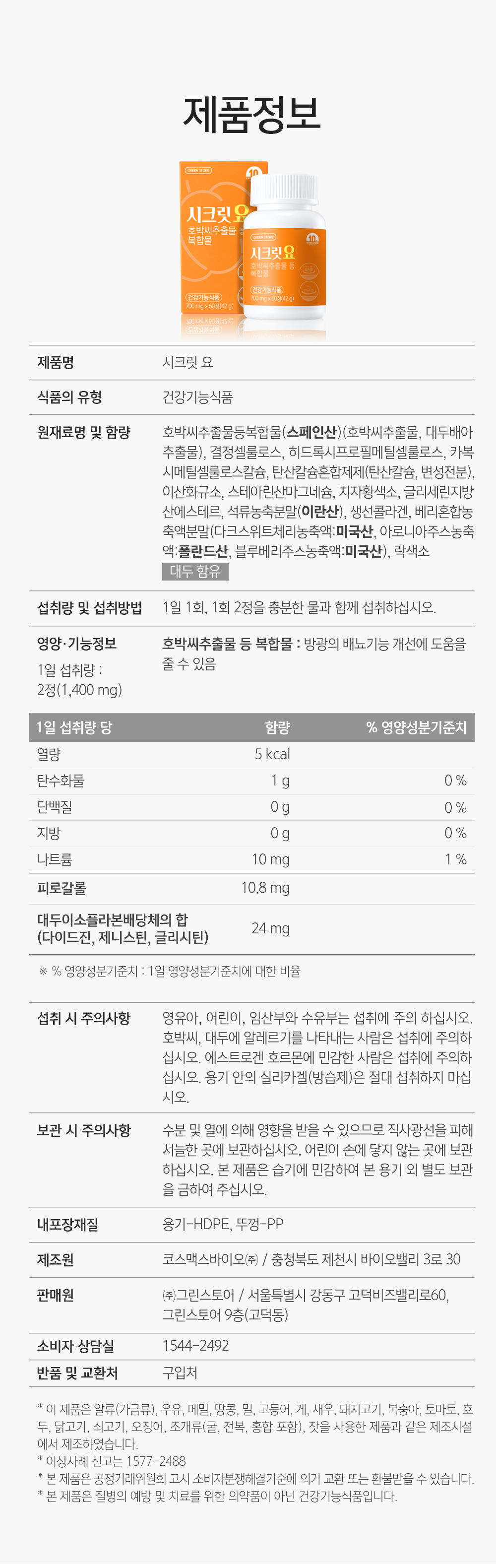 | 제조업소의 명칭과 소재지 | [제조원] 코스맥스바이오㈜ / 충청북도 제천시 바이오밸리3로 30 [판매원] ㈜그린스토어 / 경기도 성남시 분당구 느티로 16, 807호(정자동, 젤존타워1) |