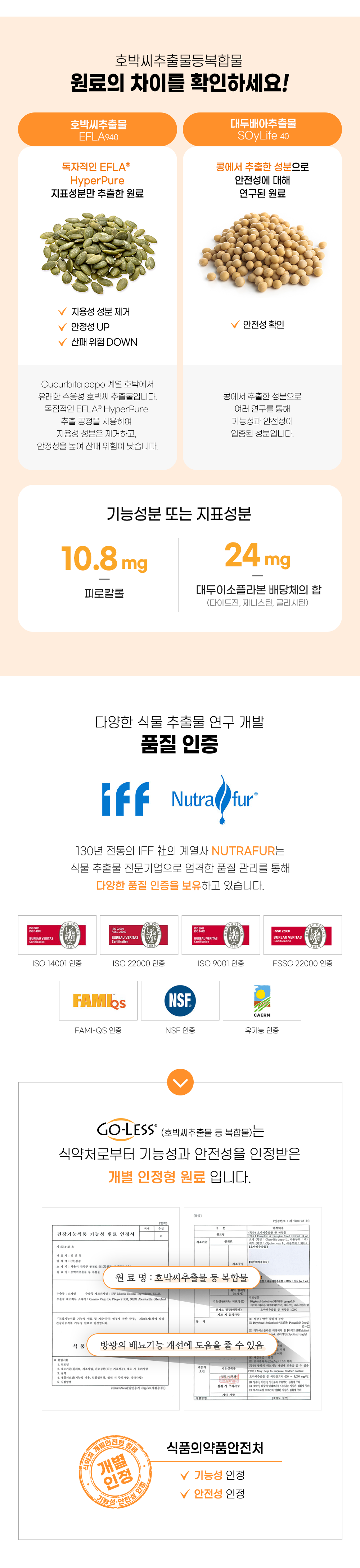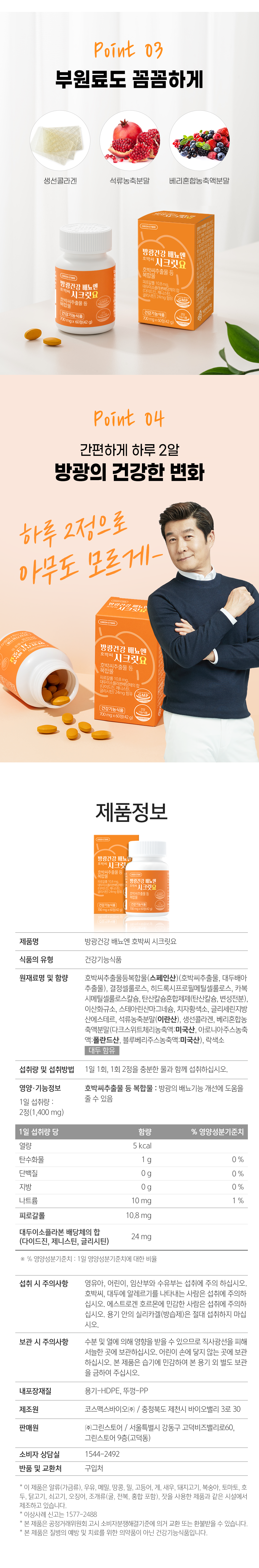 | 원료명 및 함량 | 호박씨추출물등복합물(스페인산)(호박씨추출물, 대두배아추출물), 결정셀룰로스, 히드록시프로필메틸셀룰로스, 카복시메틸셀룰로스칼슘, 이산화규소, 탄산칼슘혼합제제(탄산칼슘, 변성전분), 이산화규소, 스테아린산마그네슘, 치자황색소, 글리세린지방산에스테르, 석류농축분말(이란산), 생선콜라겐, 베리혼합농축액분말(다크스위트체리농축액:미국산, 아로니아주스농축액:폴란드산, 블루베리주스농축액:미국산), 락색소 [대두 함유] |