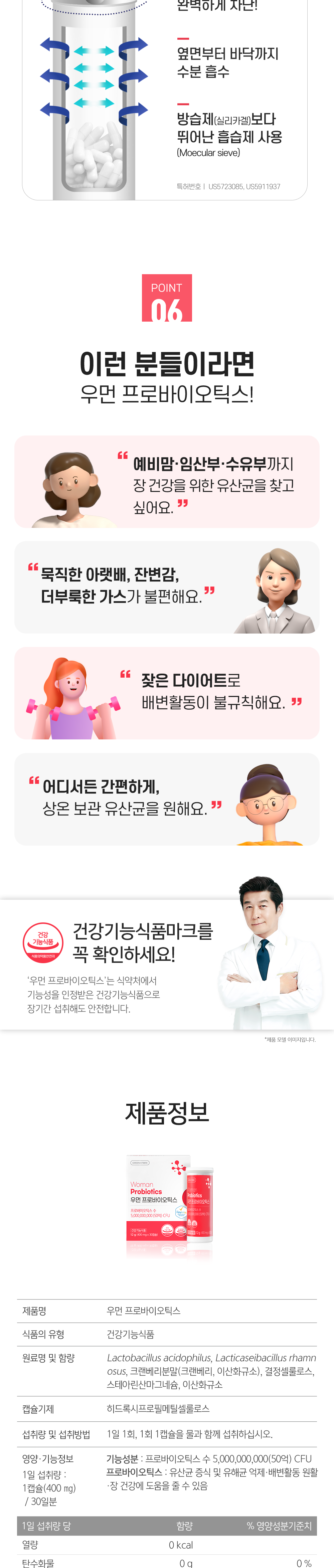 | 영양정보 | 1일 섭취량 : 1캡슐(400㎎) / 30일분 [1일 섭취량 당 함량] 열량 0kcal, 탄수화물 0g(0%), 단백질 0g(0%), 지방 0g(0%), 나트륨 0㎎(0%) 기능성분 : 프로바이오틱스 수 5,000,000,000(50억) CFU |