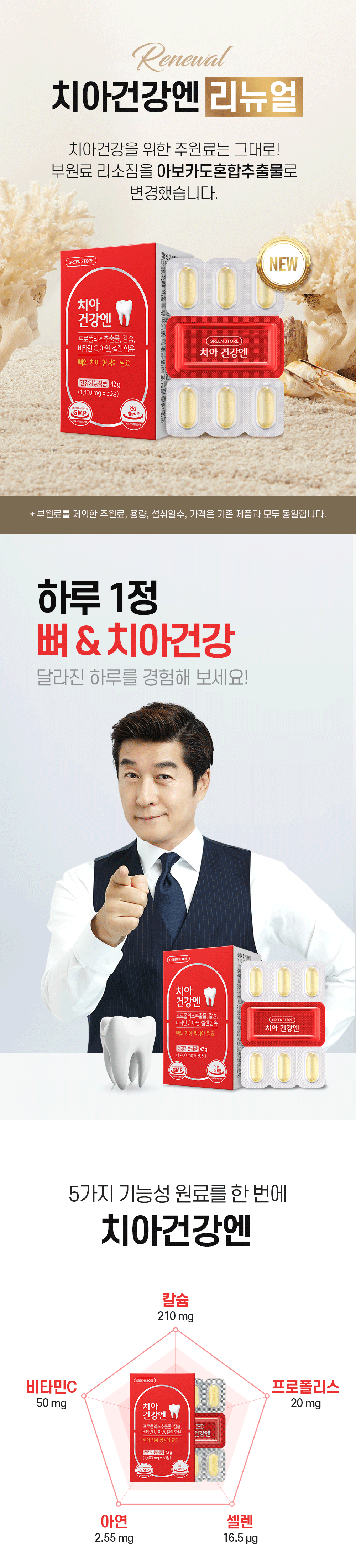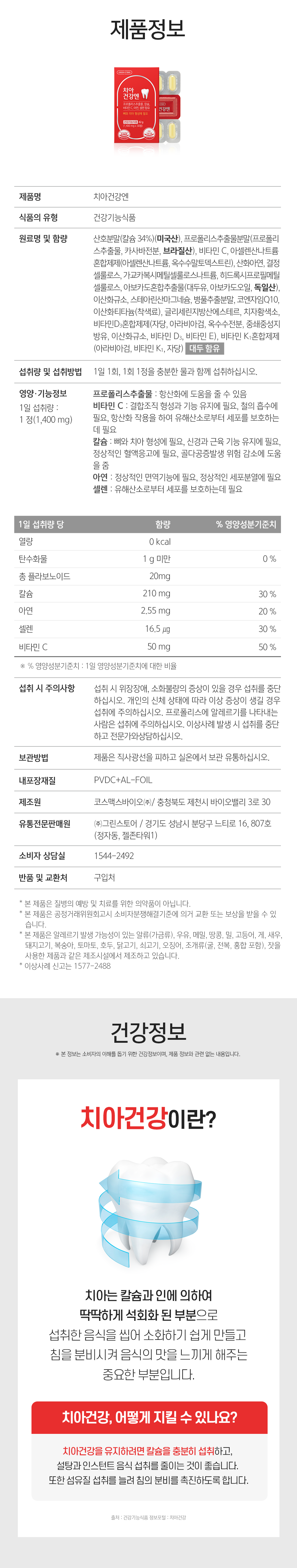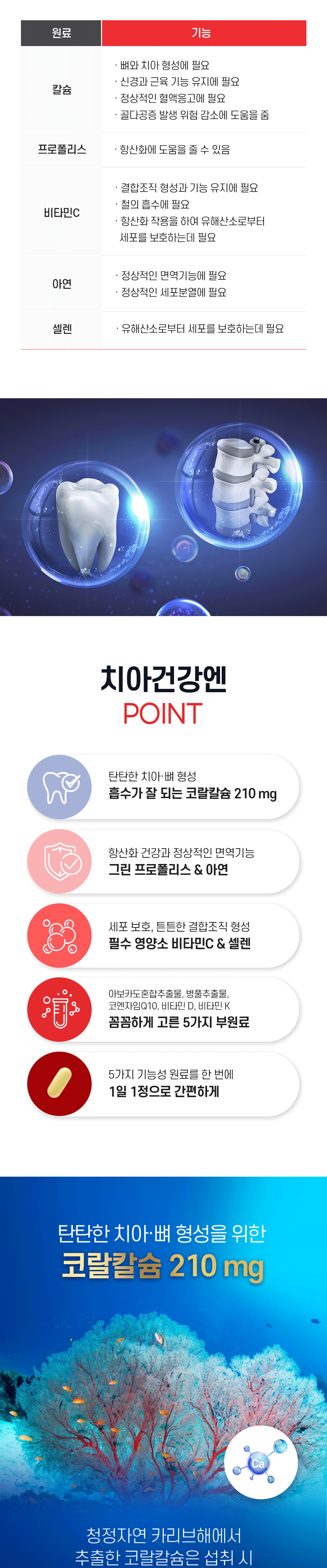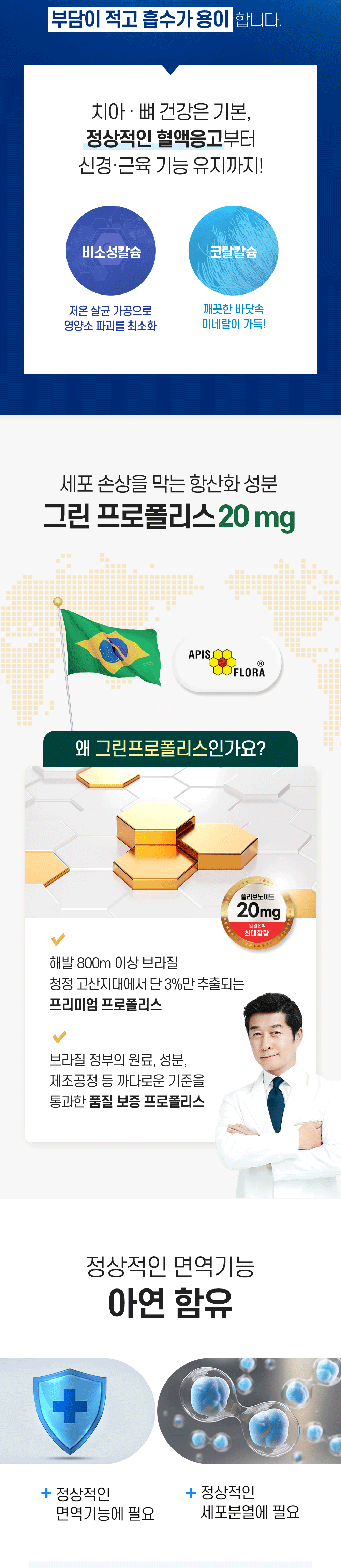 | 원료명 및 함량 | 산호분말(칼슘 34%)(미국산), 프로폴리스추출물분말(프로폴리스추출물, 카사바전분, 브라질산), 비타민C, 아셀렌산나트륨혼합제제(아셀렌산나트륨, 옥수수말토덱스트린), 산화아연, 결정셀룰로스, 가교카복시메틸셀룰로스나트륨, 히드록시프로필메틸셀룰로스, 아보카도혼합추출물(대두유, 아보카도오일, 독일산), 이산화규소, 스테아린산마그네슘, 병풀추출분말, 코엔자임Q10, 이산화티타늄(착색료), 글리세린지방산에스테르, 치자황색소, 비타민D3혼합제제(자당, 아라비아검, 옥수수전분, 중쇄중성지방유, 이산화규소, 비타민 D3, 비타민 E), 비타민 K1 혼합제제(아라비아검, 비타민 K1, 자당) [대두 함유] |