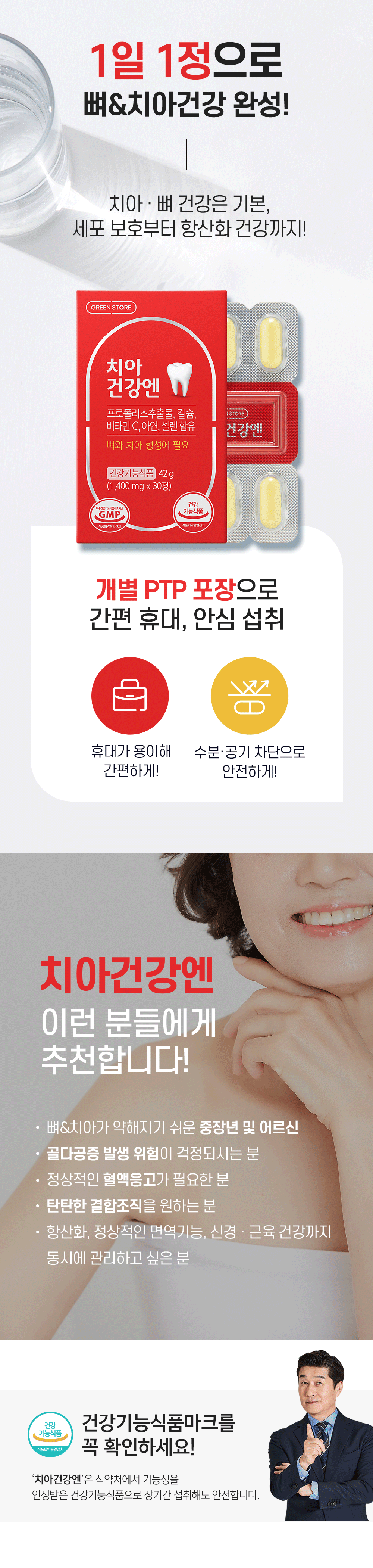 | 섭취 시 주의사항 및 부작용 발생 가능성 | 1일 1회, 1회 1정을 충분한 물과 함께 섭취하십시오. / 1일 1회, 1회 1정을 충분한 물과 함께 섭취하십시오.섭취 시 위장장애, 소화불량의 증상이 있을 경우 섭취를 중단하십시오. 개인의 신체상태에 따라 이상 증상이 생길 경우 섭취에 주의하십시오. 프로폴리스에 알레르기를 나타내는 사람은 섭취에 주의하십시오. |