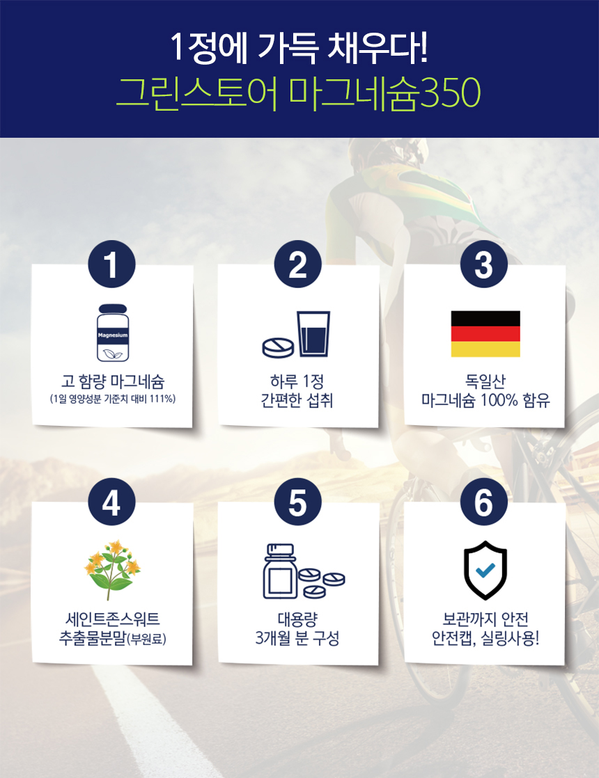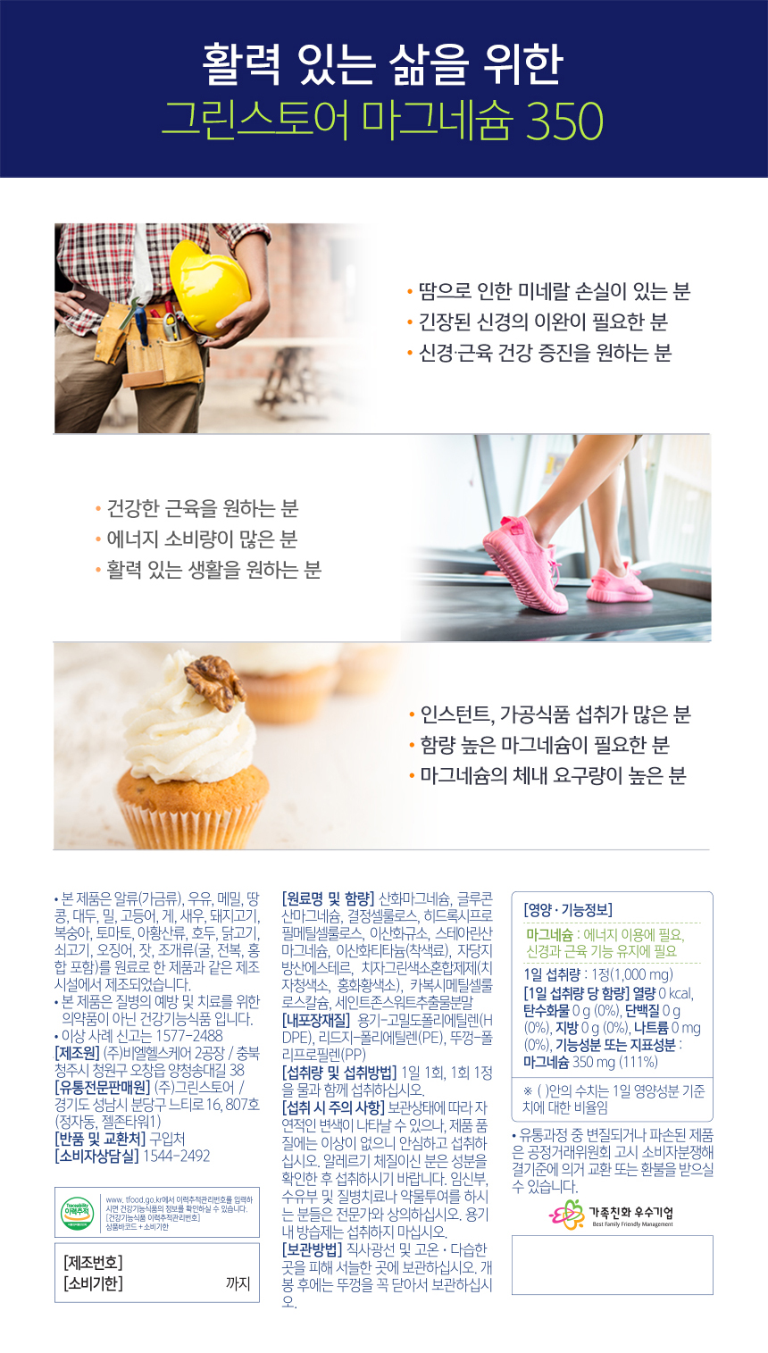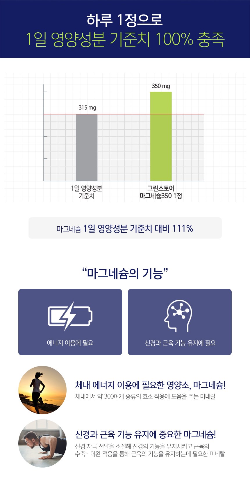 | 영양정보 | 1일 섭취량 : 1정(1,000mg) [1일 섭취량 당 함량] 열량 0kcal, 탄수화물 0g(0%), 단백질 0g(0%), 지방 0g(0%), 나트륨 0mg(0%), 기능성분 또는 지표성분 : 마그네슘 350mg(111%) |