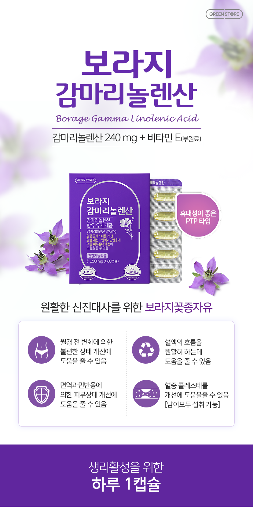 | 원료명 및 함량 | 보라지유(네덜란드산), d-α-토코페롤 [캡슐기제] 젤라틴(돈피), 글리세린, D-솔비톨액 [대두, 돼지고기 함유] |