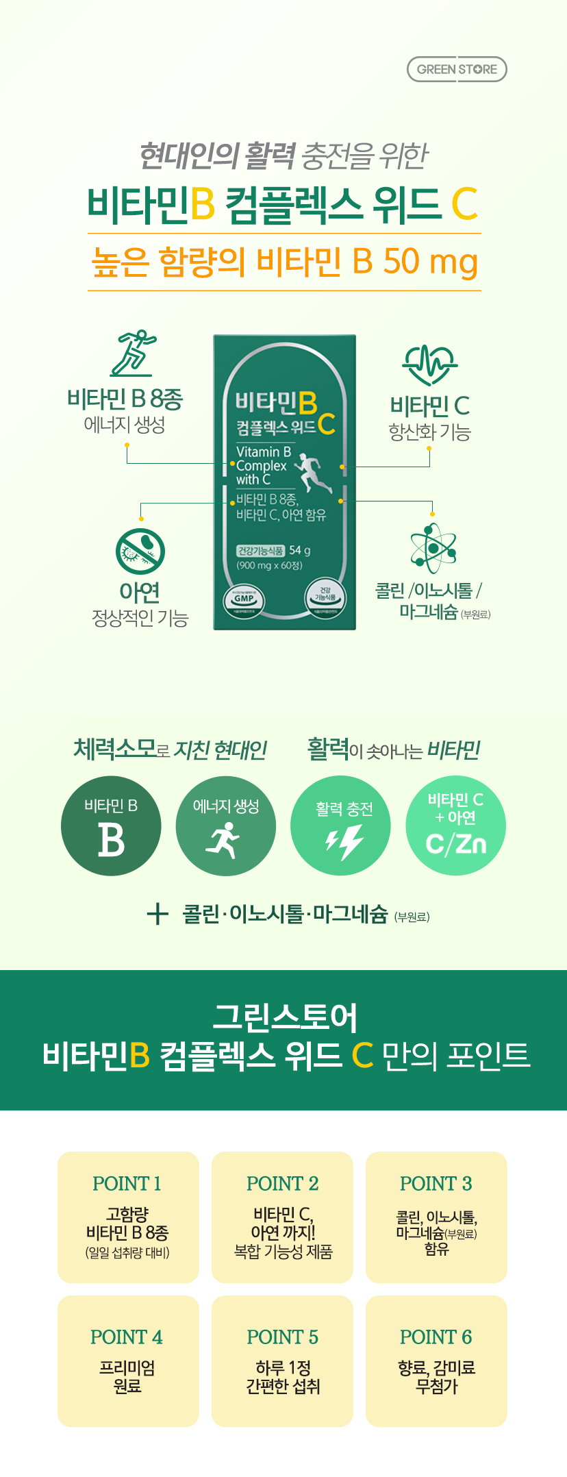 | 기능정보 | [비타민 B1] 탄수화물과 에너지 대사에 필요 [비타민 B6] 단백질 및 아미노산이용에 필요, 혈액의 호모시스테인 수준을 정상으로 유지하는데 필요 [비타민 B2·나이아신] 체내 에너지 생성에 필요 [판토텐산·비오틴] 지방, 탄수화물, 단백질 대사와 에너지 생성에 필요 [비타민 B12] 정상적인 엽산 대사에 필요 [비타민 C] 결합조직 형성과 기능유지에 필요, 철의 흡수에 필요, 항산화 작용을 하여 유해산소로부터 세포를 보호하는데 필요 [아연] 정상적인 면역기능에 필요, 정상적인 세포분열에 필요 [엽산] 세포와 혈액생성에 필요, 태아 신경관의 정상 발달에 필요, 혈액의 호모시스테인수준을 정상으로 유지하는데 필요 |