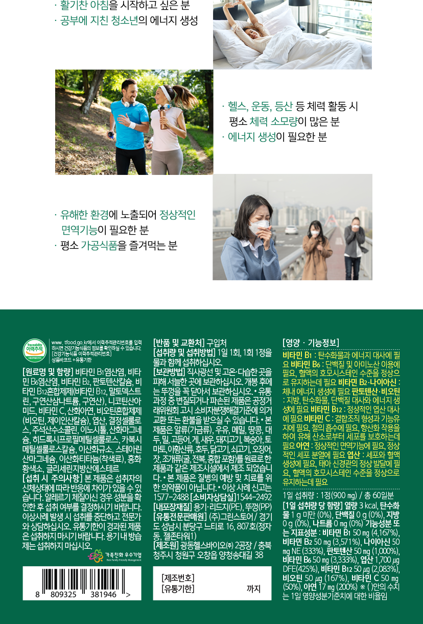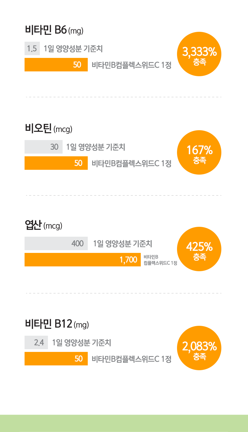 | 영양정보 | 1일 섭취량 : 1정(900㎎) / 총 60일분 [1일 섭취량 당 함량] 열량 3kcal, 탄수화물 1g미만(0%), 단백질 0g(0%), 지방 0g(0%), 나트륨 0㎎(0%) 기능성분 또는 지표성분 : 비타민 B1 50㎎(4,167%), 비타민 B2 50㎎(3,571%), 나이아신 50㎎NE(333%), 판토텐산 50㎎(1,000%), 비타민 B6 50㎎(3,333%), 엽산 엽산 1,700㎍ DFE(425%), 비타민 B12 50㎍(2,083%), 비오틴 50㎍(167%), 비타민 C 50㎎(50%), 아연 17㎎(200%) |