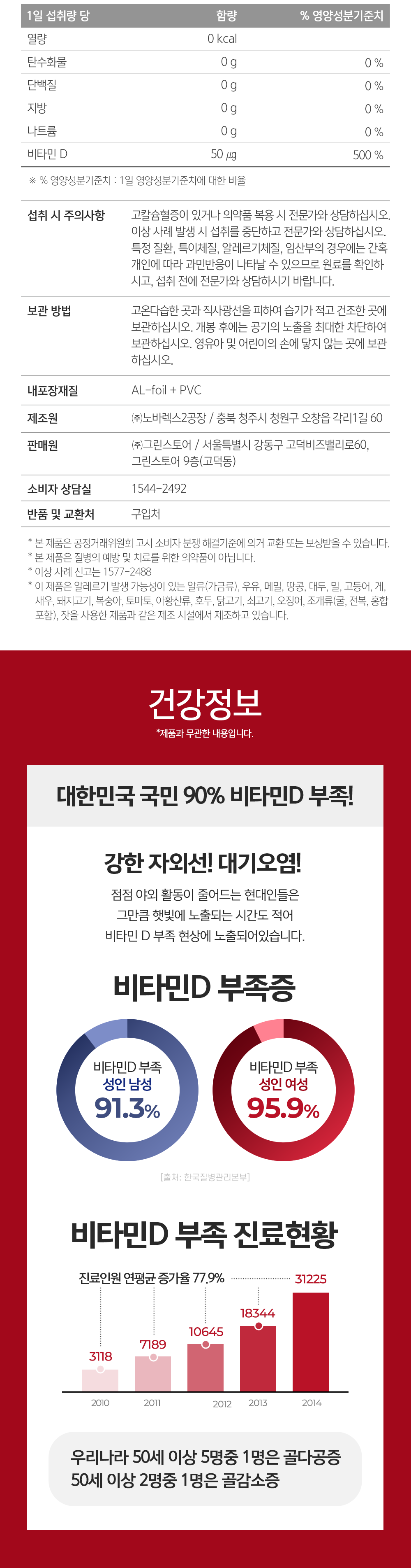 | 원료명 및 함량 | 비타민 D3 혼합제제{비타민 D3, 중쇄중성지방, 비타민E(dl-α-토코페롤),스위스산}, 올리브유(스페인산) [캡슐기제] 젤라틴, 글리세린 [돼지고기 함유] |