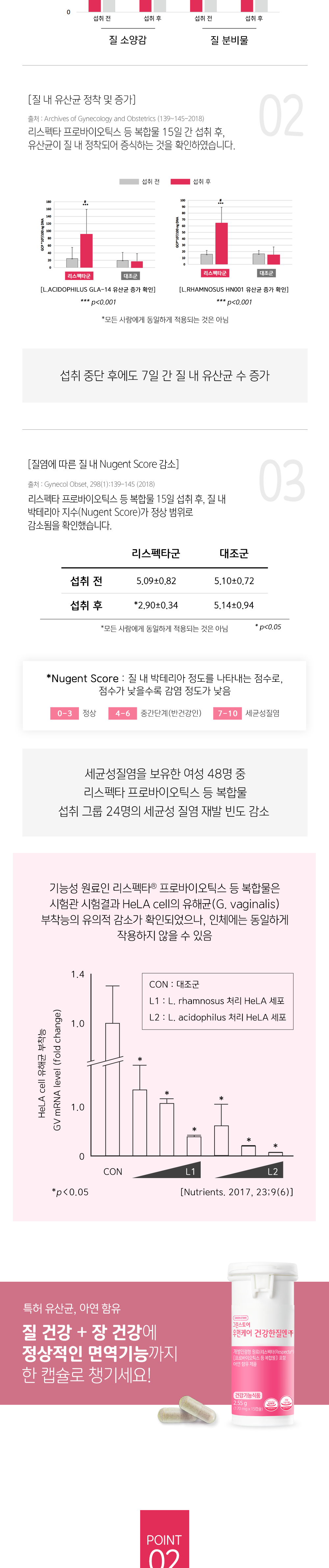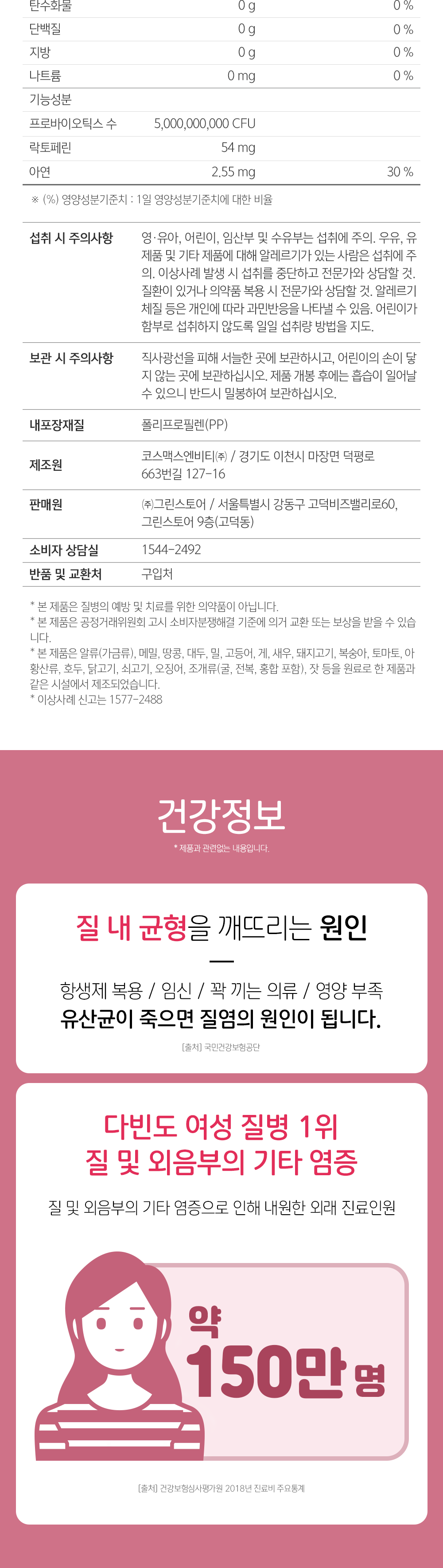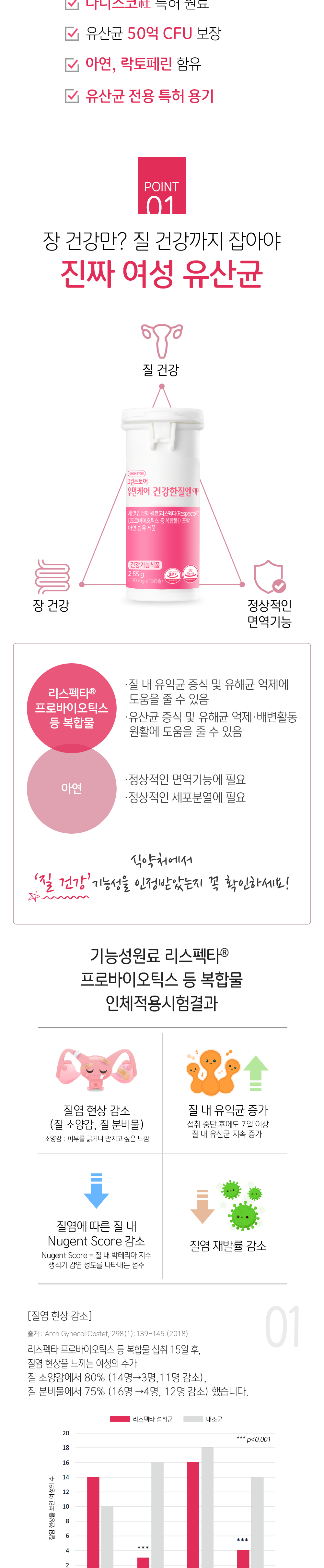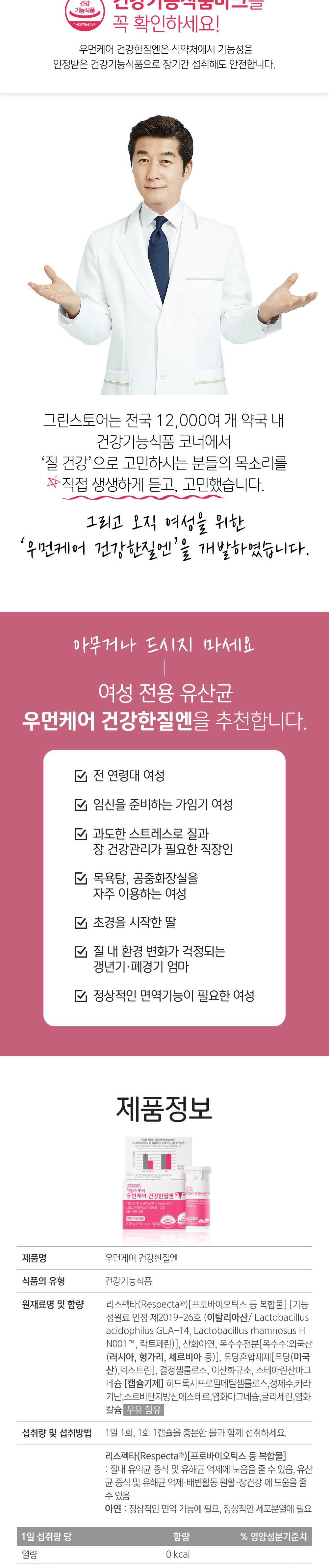 | 기능정보 | [리스펙타(Respecta®)[프로바이오틱스 등 복합물] : 질내 유익균 증식 및 유해균 억제에 도움을 줄 수 있음, 유산균 증식 및 유해균 억제·배변활동 원활·장건강 에 도움을 줄 수 있음 [아연] : 정상적인 면역 기능에 필요, 정상적인 세포분열에 필요 |