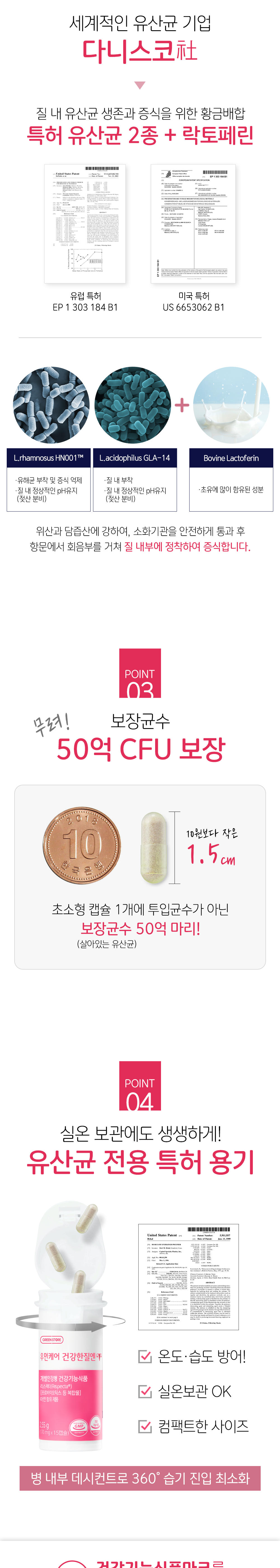 | 원료명 및 함량 | 리스펙타(Respecta®)[프로바이오틱스 등 복합물] [기능성원료인정 제2019-26호(이탈리아산/ Lactobacillus acido philus GLA-14, Lactobacillus rhamnosus HN001™, 락토페린)], 산화아연, 옥수수전분[옥수수:외국산(러시아, 헝가리, 세르비아 등)], 유당혼합제제[유당(미국산), 덱스트린], 결정셀룰로스, 이산화규소, 스테아린산마그네슘 [캡슐기제] 히드록시프로필메틸셀룰로스, 정제수, 카라기난, 자당지방산에스테르, 아미드펙틴, 염화마그네슘, 피로인산칼륨, 빙초산 [우유 함유] |