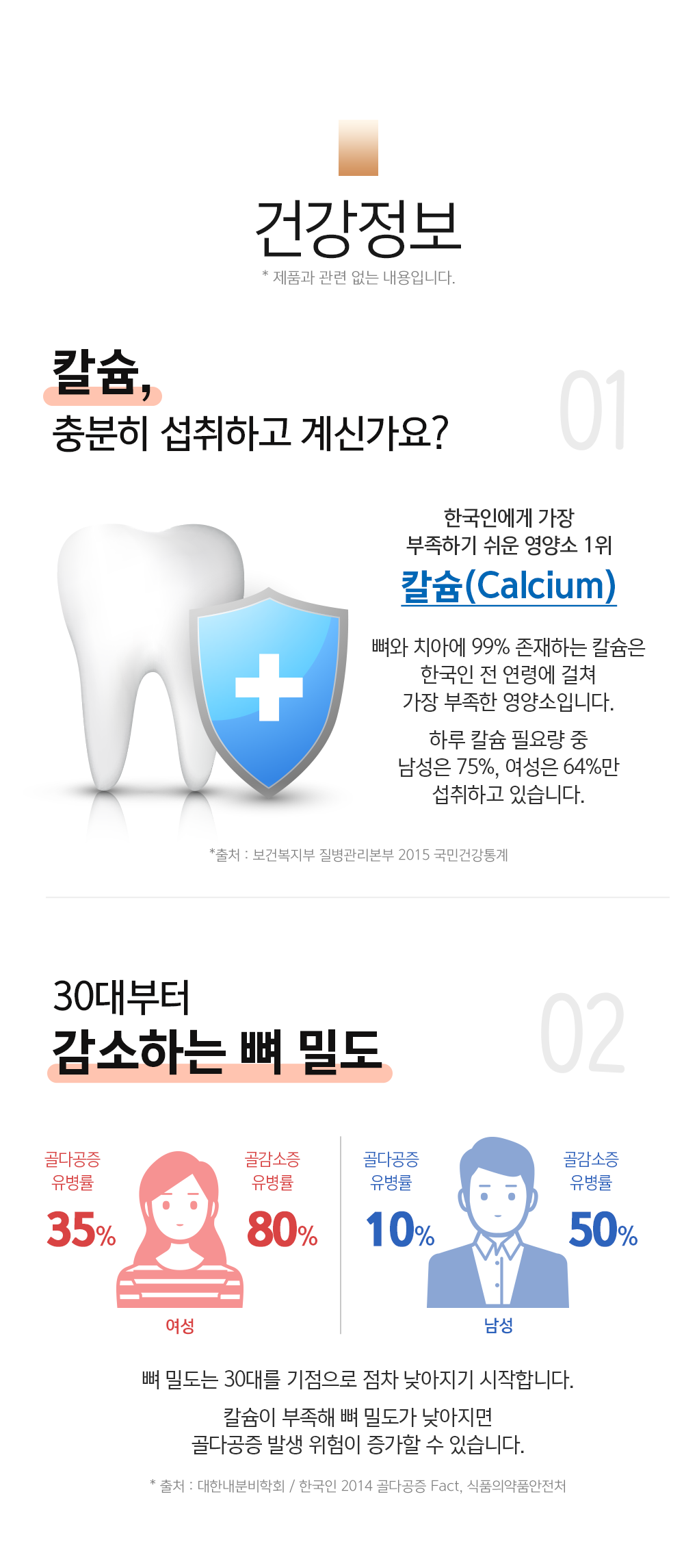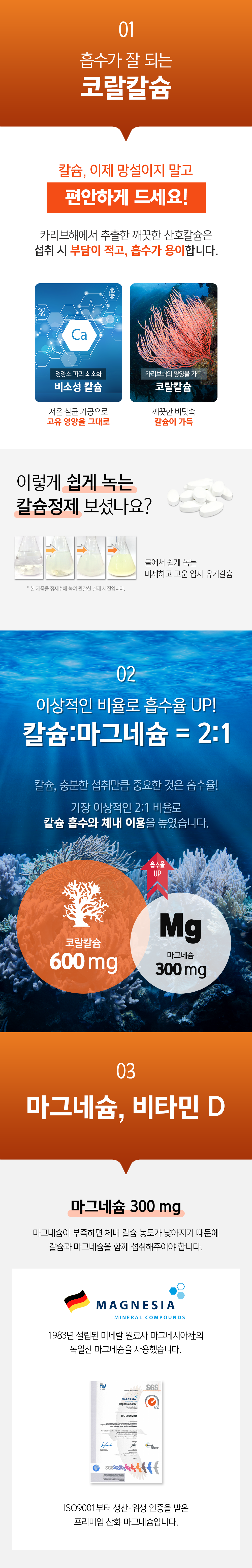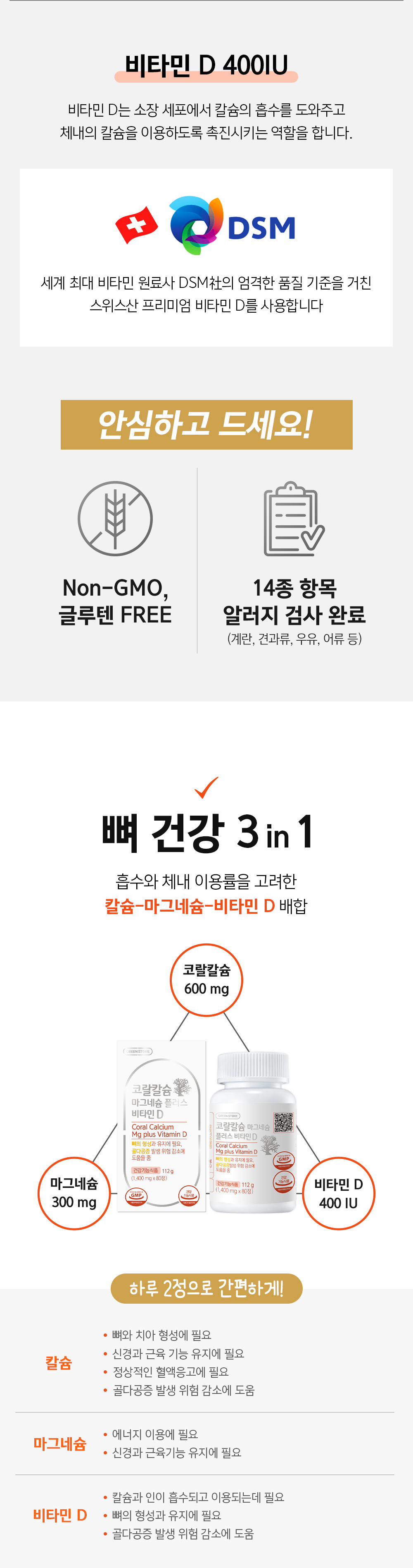 | 기능정보 | [칼슘] 뼈와 치아 형성에 필요, 신경과 근육 기능 유지에 필요, 정상적인 혈액 응고에 필요, 골다공증발생 위험 감소에 도움을 줌 [마그네슘] 에너지 이용에 필요, 신경과 근육기능 유지에 필요 [비타민 D] 칼슘과 인이 흡수되고 이용되는데 필요, 뼈의 형성과 유지에 필요, 골다공증발생 위험 감소에 도움을 줌 |