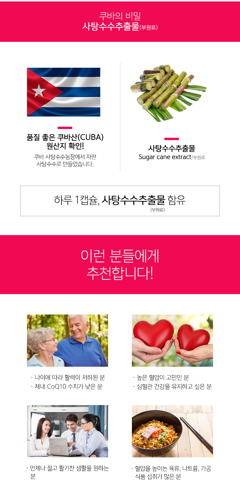| 원료명 및 함량 | 코엔자임Q10, 대두유, 사탕수수추출물, 해바라기레시틴, 밀납 [돼지고기(젤라틴), 대두 함유] [캡슐기제] 젤라틴(돈피), 정제수, 글리세린, 착색료(수용성안나토, 이산화티타늄) |