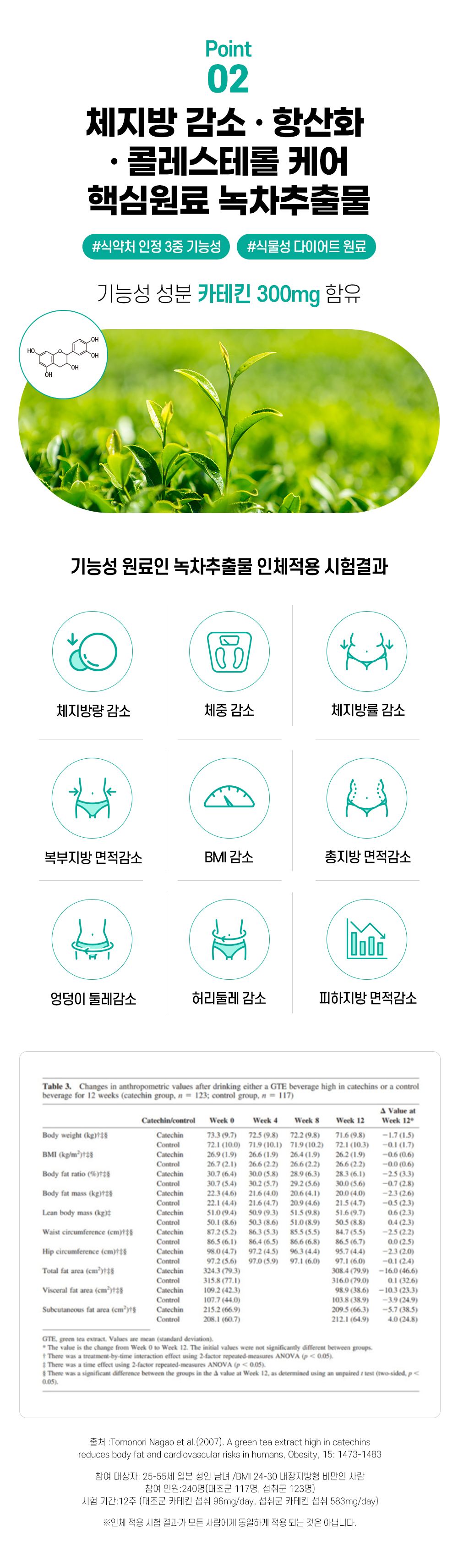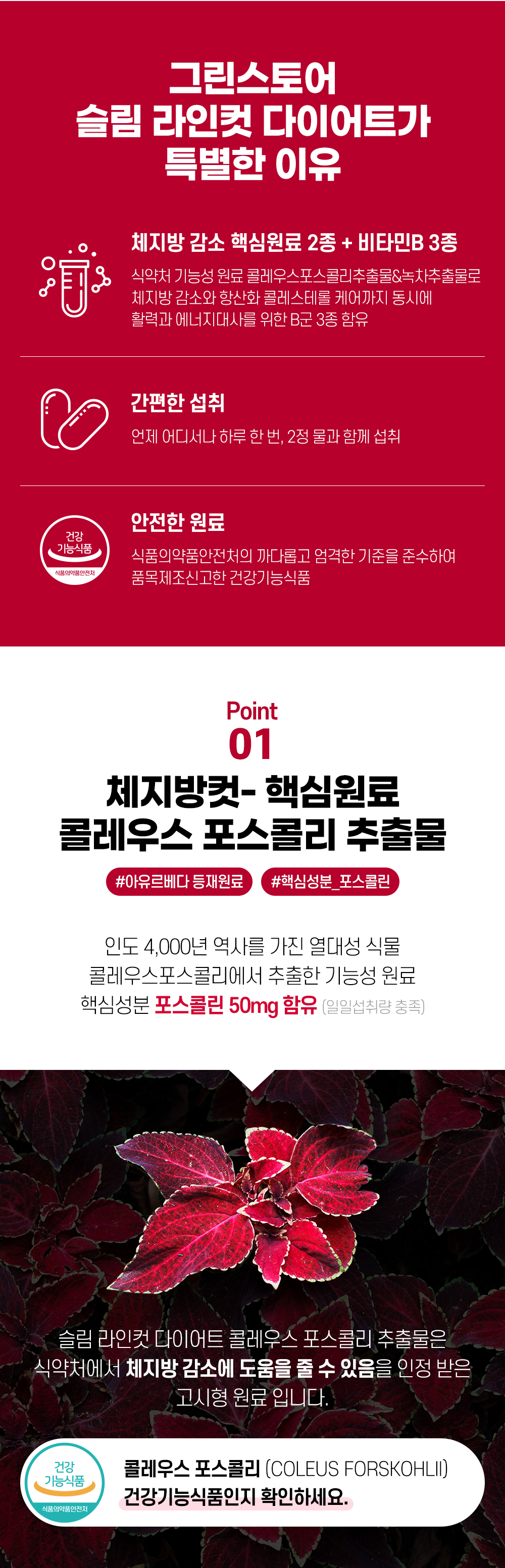 | 섭취 시 주의사항 및 부작용 발생 가능성 | 1일 1회, 1회 2정을 물과 함께 섭취하십시오. / 특정질환, 특이체질, 알레르기체질, 임산부의 경우에는 간혹 개인에 따라 과민반응이 나타날 수 있으므로 원료를 확인하시고 섭취전에 전문가와 상담하시기 바랍니다. 이상사례 발생 시 섭취를 중단하고 전문가와 상담할 것 [콜레우스포스콜리추출물] 어린이, 임산부 및 수유부는 섭취를 피할것, 항응고제 또는 혈압조절제를 복용하거나 혈압이 낮은 경우 전문가와 상담할 것 [녹차추출물] 어린이, 임산부 및 수유부는 섭취를 피할 것, 간질환이 있거나 의약품 복용 시 전문가와 상담할 것, 카페인이 함유되어 있어 초조감, 불면 등을 나타낼 수 있음, 식사 후 섭취할 것, 카페인을 함유한 식품의 섭취에 주의할 것 |