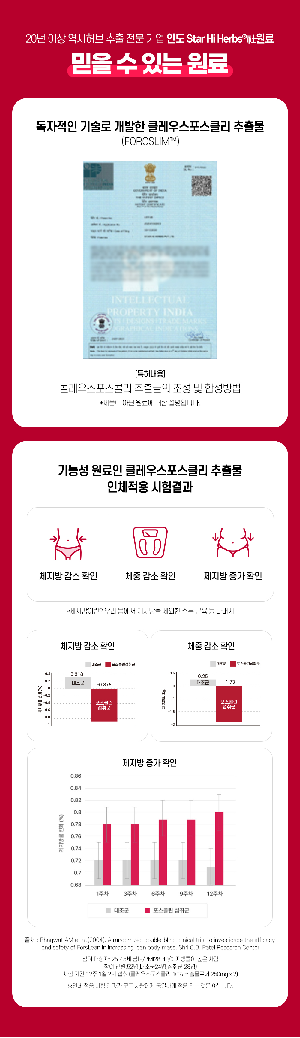 | 기능정보 | [콜레우스포스콜리추출물] 체지방 감소에 도움을 줄 수 있음 [녹차추출물] 항산화·체지방 감소·혈중 콜레스테롤 개선에 도움을 줄 수 있음 [비타민 B1] 탄수화물과 에너지 대사에 필요 [비타민 B6] 단백질 및 아미노산 이용에 필요, 혈액의 호모시스테인 수준을 정상으로 유지하는데 필요 [판토텐산] 지방, 탄수화물, 단백질 대사와 에너지 생성에 필요 |