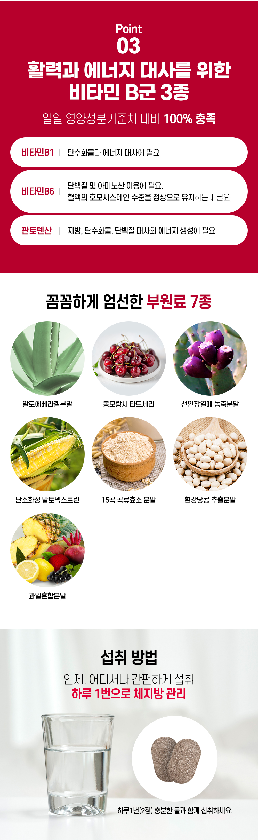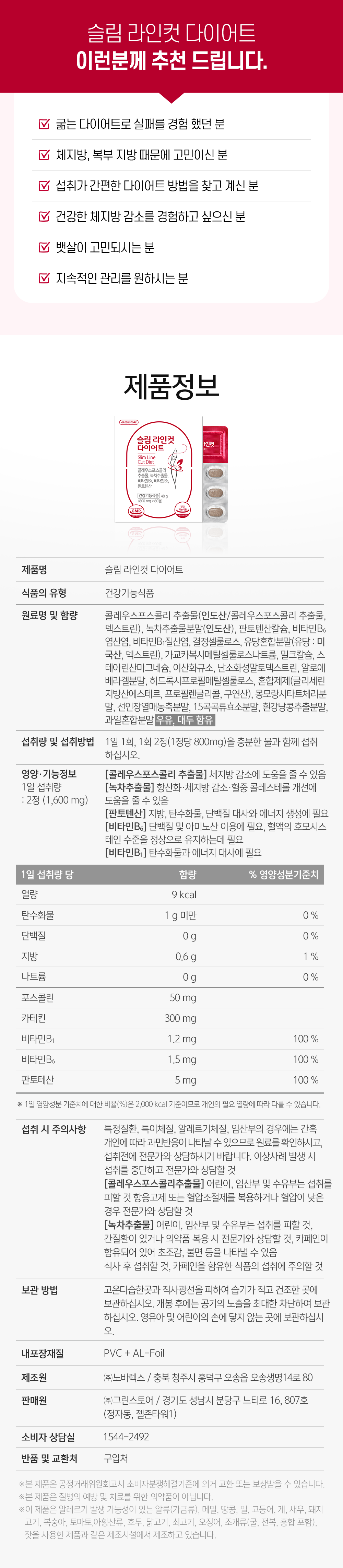 | 원료명 및 함량 | 콜레우스포스콜리 추출물(인도산/콜레우스포스콜리 추출물, 덱스트린), 녹차추출물분말(인도산), 판토텐산칼슘, 비타민 B6 염산염, 비타민 B1질산염, 결정셀룰로스, 유당혼합분말(유당:미국산, 덱스트린), 가교카복시메틸셀룰로스나트륨, 밀크칼슘, 스테아린산마그네슘, 이산화규소, 난소화성말토덱스트린, 알로에베라겔분말, 히드록시프로필메틸셀룰로스, 혼합제제(글리세린지방산에스테르, 프로필렌글리콜, 구연산), 몽모랑시타트체리분말, 선인장열매농축분말, 15곡 곡류효소분말, 흰강낭콩추출분말, 과일혼합분말 [우유, 대두 함유] |
