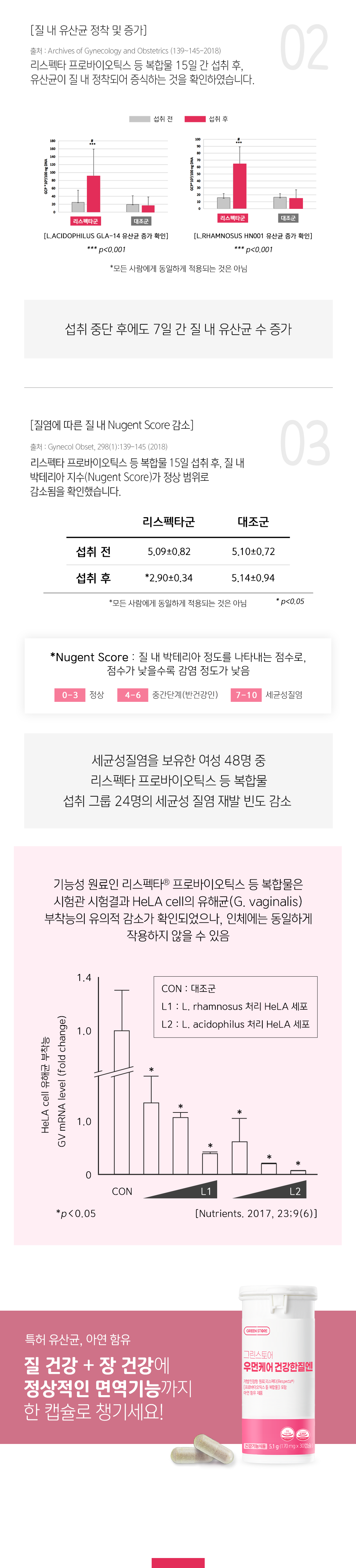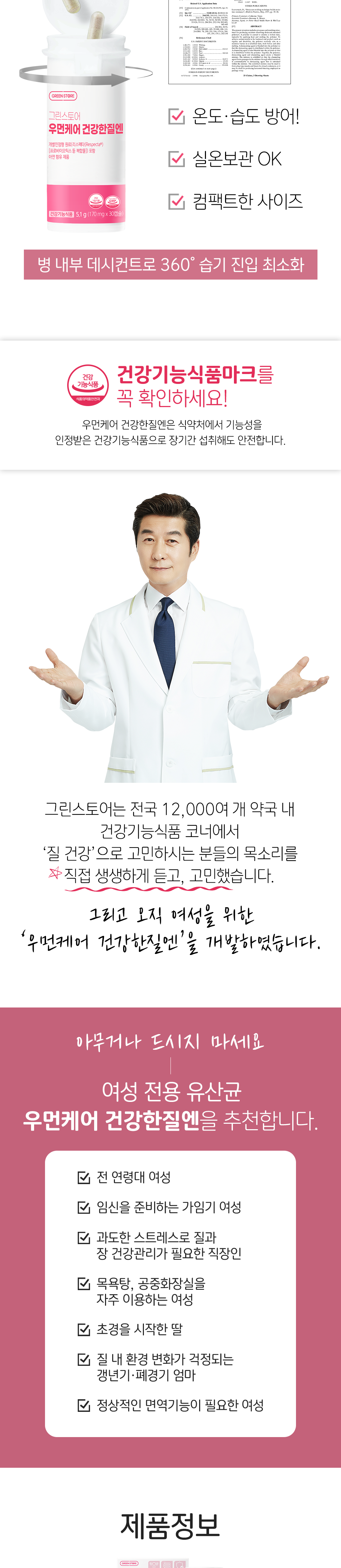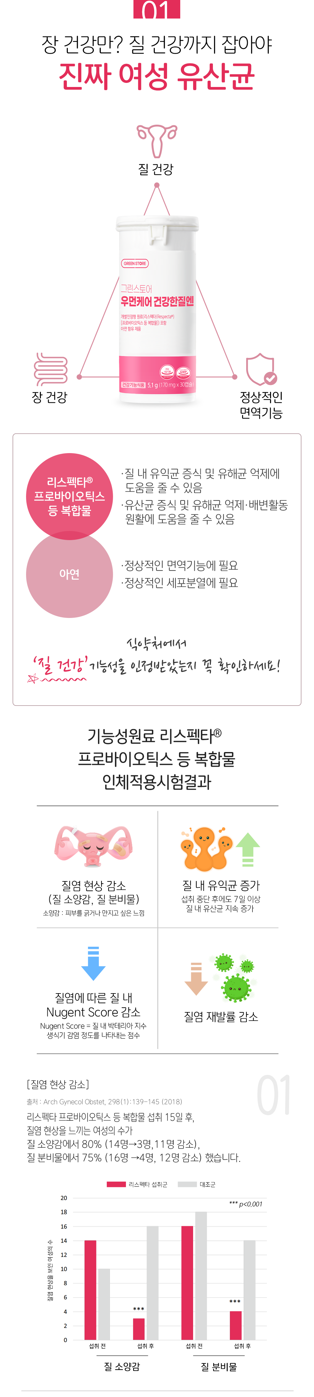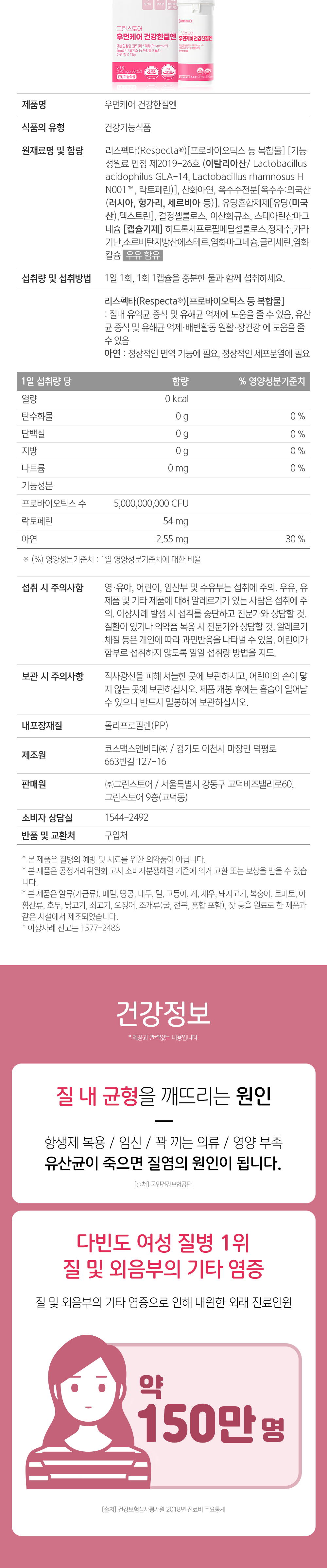 | 기능정보 | [리스펙타(Respecta®)[프로바이오틱스 등 복합물] : 질내 유익균 증식 및 유해균 억제에 도움을 줄 수 있음, 유산균 증식 및 유해균 억제·배변활동 원활·장건강 에 도움을 줄 수 있음 [아연] : 정상적인 면역 기능에 필요, 정상적인 세포분열에 필요 |