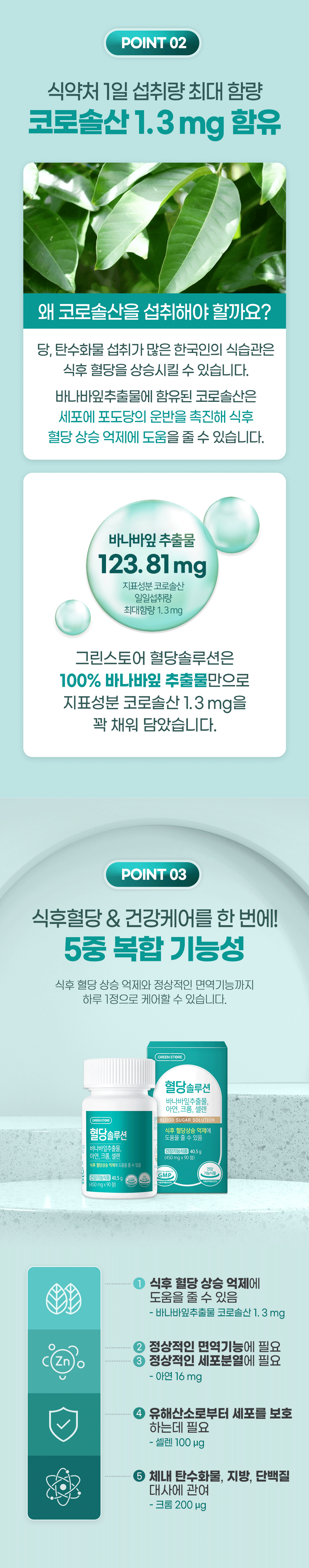 | 기능정보 | [바나바잎추출물] 식후 혈당상승 억제에 도움을 줄 수 있음 [아연] 정상적인 면역기능에 필요, 정상적인 세포분열에 필요 [셀렌] 유해산소로부터 세포를 보호하는데 필요 [크롬] 체내 탄수화물, 지방, 단백질 대사에 관여 |