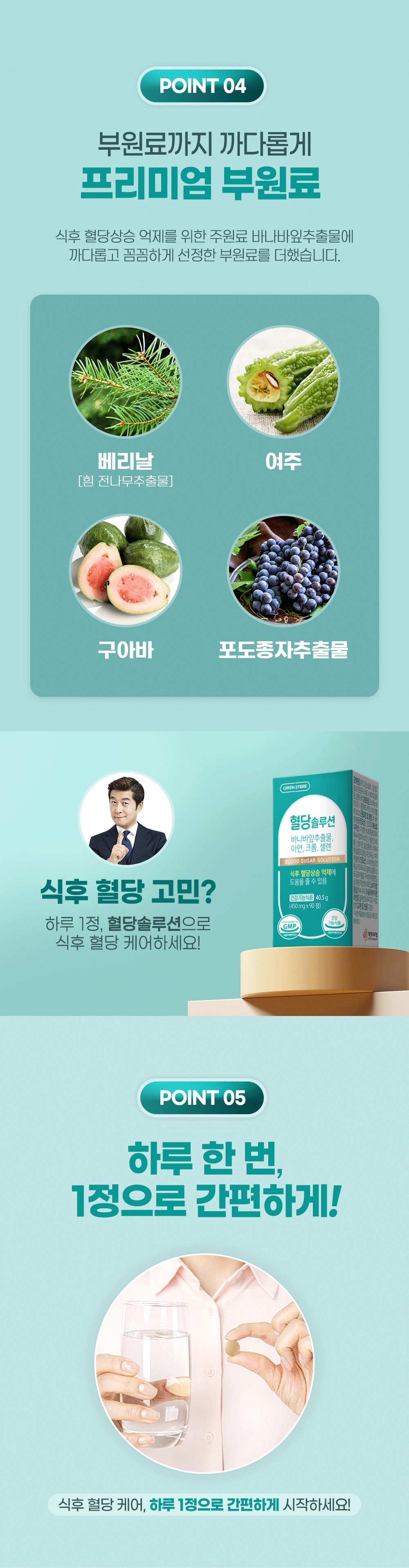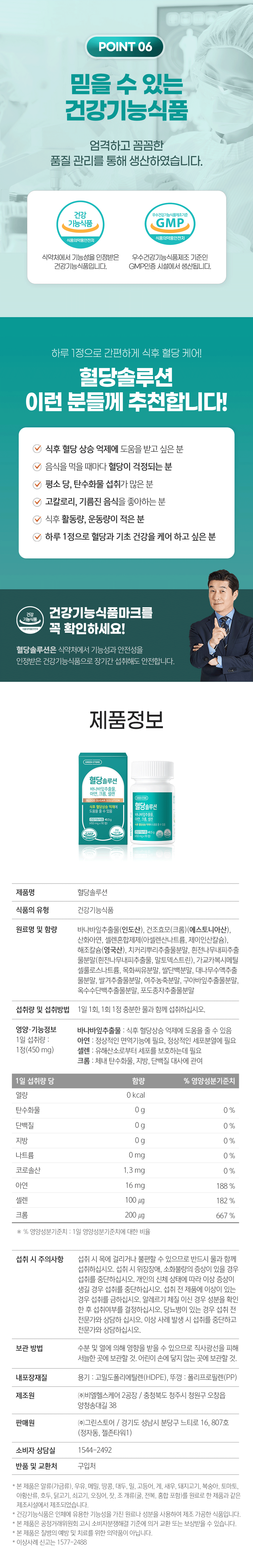 | 원료명 및 함량 | 바나바잎추출물(인도산), 건조효모 (크롬)(에스토니아산), 산화아연, 셀렌혼합제제 (아셀 렌산나트륨, 제이인산칼슘), 치커리뿌리추출물분말(벨기에산), 흰전나무내피추출물분말(흰전나무내피추출물, 말토덱스트린), 해조칼슘, 가교카복시메틸셀룰로스나트륨, 목화씨유분말, 쌀단백분말, 대나무수액추출물분말, 쌀겨추출물분말, 여주농축분말, 구아바잎추출물분말, 옥수수단백추출물분말, 포도종자추출물분말 |