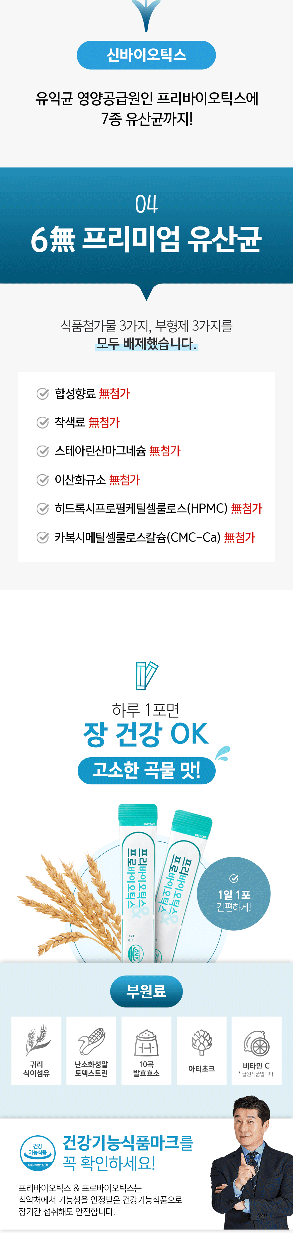 | 원료명 및 함량 | 프락토올리고당, 유산균혼합분말, 산화아연, 난소화성말토덱스트린, 귀리분말, 곡류혼합분말(보리, 현미, 멥쌀, 옥수수, 밀, 백태, 검정콩, 알파미분, 찹쌀, 쌀보리, 발아현미, 기장, 검정쌀, 율무, 수수, 차조, 참깨, 들깨, 메밀), 자일리톨혼합제제{자일리톨혼합제제(자일리톨, 폴리덱스트로스), 폴리덱스트로스}, 유당혼합분말, 곡류발효효소분말, 산화마그네슘, 혼합유산균배양건조물, 아티초크추출물분말, 비타민 C [우유, 메밀, 대두, 밀 함유] |