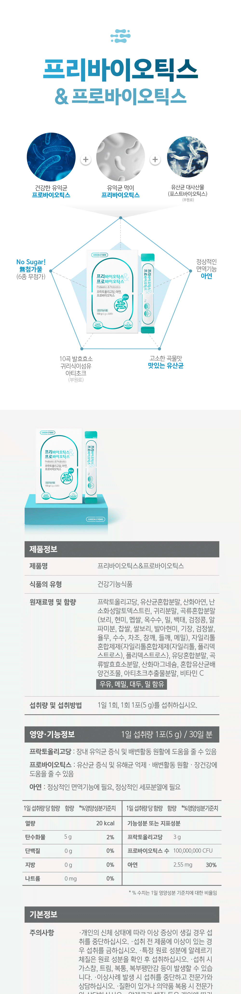 | 영양정보 | 1일 섭취량 : 1포(5g) [1일 섭취량 당 함량] 열량 20kcal, 탄수화물 5g(2%), 단백질 0g(0%), 지방 0g(0%), 나트륨 0mg(0%) 기능성분 또는 지표성분 : 프락토올리고당 3g, 프로바이오틱스 수 100,000,000 cfu, 아연 2.55mg(30%) |