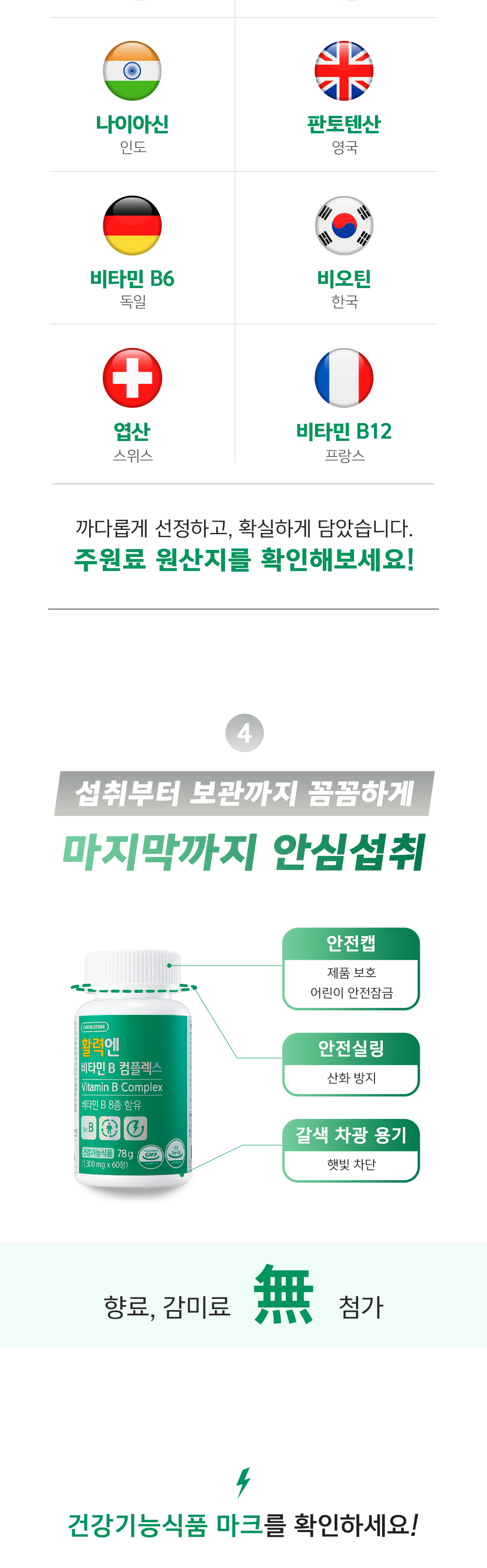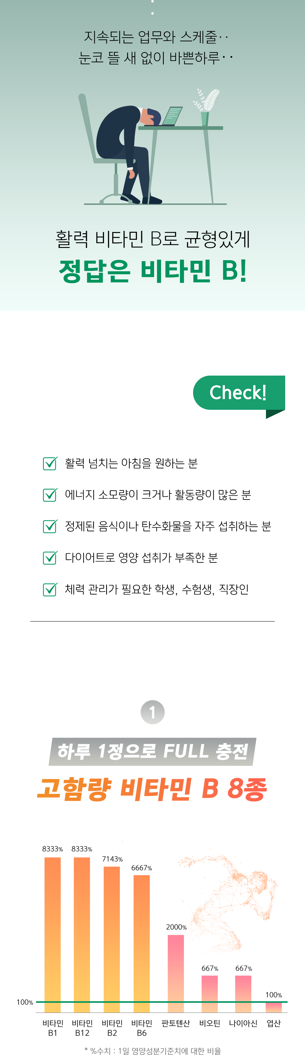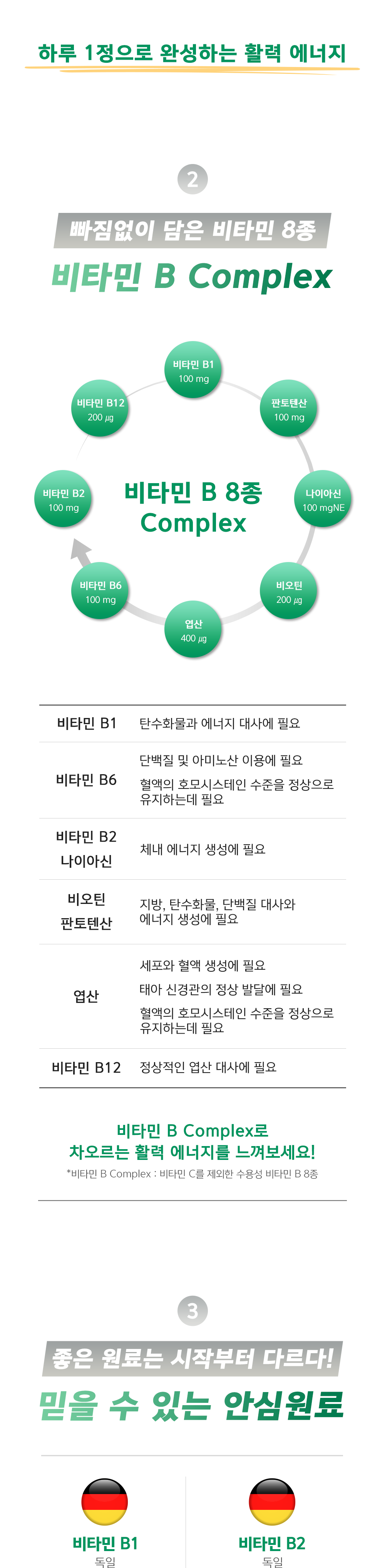 | 기능정보 | [비타민 B1] 탄수화물과 에너지 대사에 필요 [비타민 B6] 단백질 및 아미노 산 이용에 필요, 혈액의 호모시스테인 수준을 정상으로 유지하는데 필요 [비타민 B2] 체내 에너지 생성에 필요 [판토텐산] 지방, 탄수화물, 단백질 대 사와 에너지 생성에 필요 [나이아신] 체내 에너지 생성에 필요 [비타민 B12] 정상적인 엽산 대사에 필요 [비오틴] 지방, 탄수화물, 단백질 대사와 에너지 생성에 필요 [엽산] 세포와 혈액생성에 필요, 태아 신경관의 정상 발달에 필요, 혈액의 호모시스테인 수준을 정상으로 유지하는데 필요 |