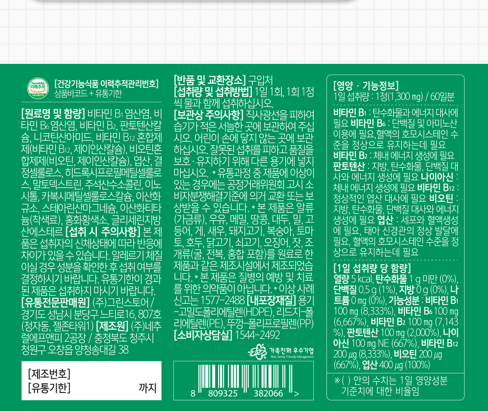 | 영양정보 | 1일 섭취량 : 1정(1,300㎎) / 60일분 [1일 섭취량 당 함량] 열량 5kcal, 탄수화물 1g미만(0%), 단백질 0.5g(1%), 지방 0g(0%), 나트륨 0㎎(0%), 기능성분 : 비타민 B1 100㎎(8,333%), 비타민 B6 100㎎(6,667%), 비타민 B2 100㎎(7,1 43%), 판토텐산 100㎎(2,000%), 나이아신 100㎎NE(667%), 비타민 B12 200㎍(8,333%), 비오틴 200㎍(667%), 엽산400㎍(100%) |
