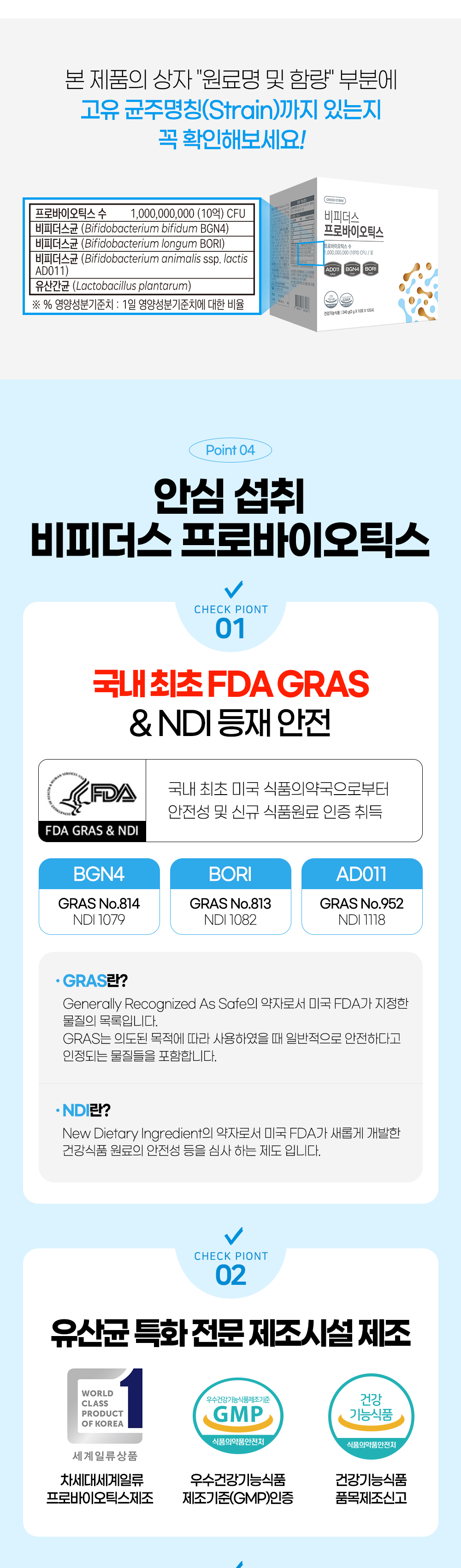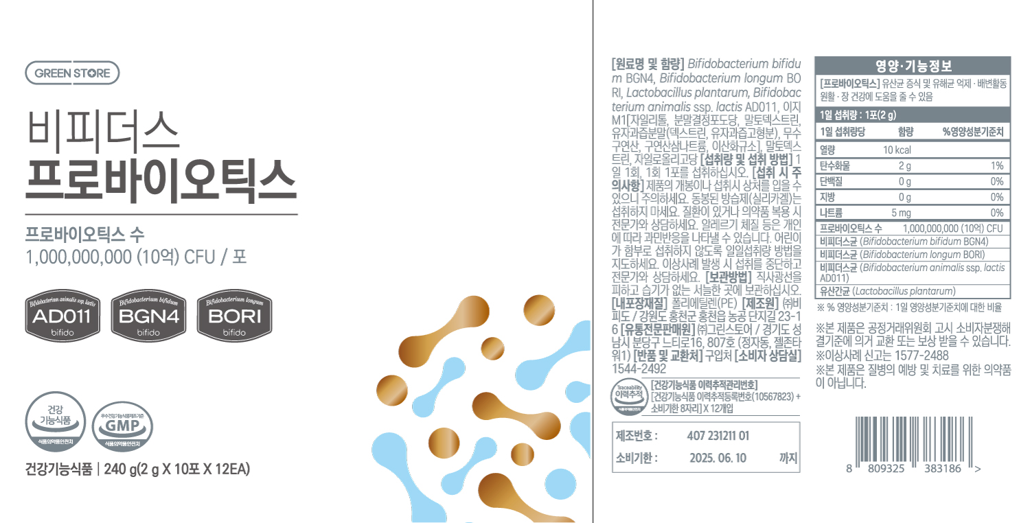 | 원료명 및 함량 | Bifidobacterium bifidum BGN4, Bifidobacterium longum BORI, Lactobacillus plantarum, Bifidobacterium animalis ssp. Lactis AD011, 이지M1[자일리톨, 분말결정포도당, 말토덱스트린, 유자과즙분말(덱스트린, 유자과즙고형분), 무수구연산, 구연산삼나트륨, 이산화규소], 말토덱스트린, 자일로올리고당 |