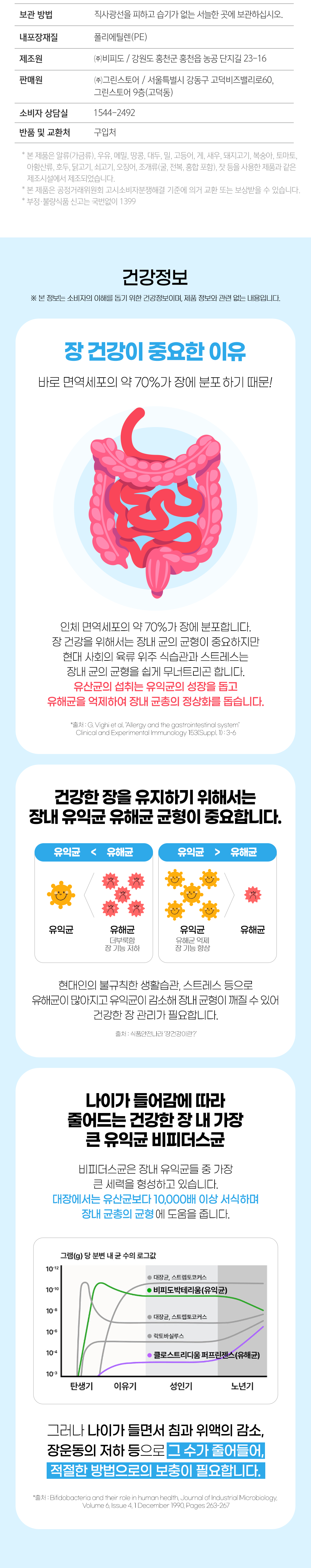 | 기능정보 | [프로바이오틱스] 유산균 증식 및 유해균 억제·배변활동 원활·장 건강에 도움을 줄 수 있음 |