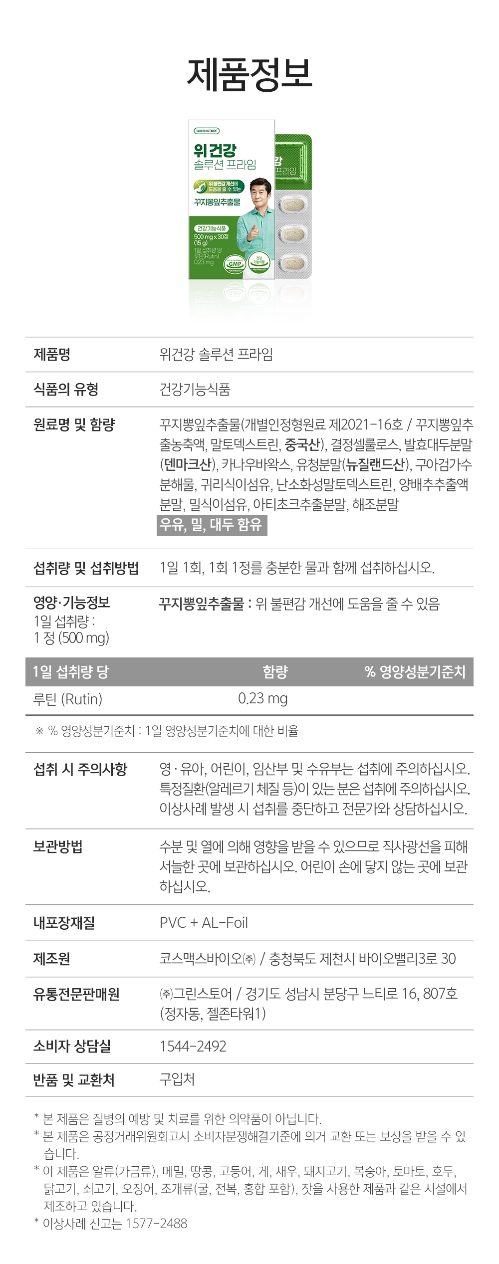 | 소비자안전을 위한 주의사항 | ·본 제품은 질병의 예방 및 치료를 위한 의약품이 아닌 건강기능식품입니다. ·본 제품은 공정거래위원회 고시 소비자분쟁해결기준에 의거 교환 또는 환불 받을 수 있습니다. ·이 제품은 알레르기 발생 가능성이 있는 알류(가금류), 메밀, 땅콩, 밀, 고등어, 게, 새우, 돼지고기, 복숭아, 토마토, 아황산류, 호두, 닭고기, 쇠고기, 오징어, 조개류(굴, 전복, 홍합 포함), 잣을 사용한 제품과 같은 제조시설에서 제조하고 있습니다. ·이상사례 신고는 1577-2488 / (표시광고 사전심의필 : 240910571) |