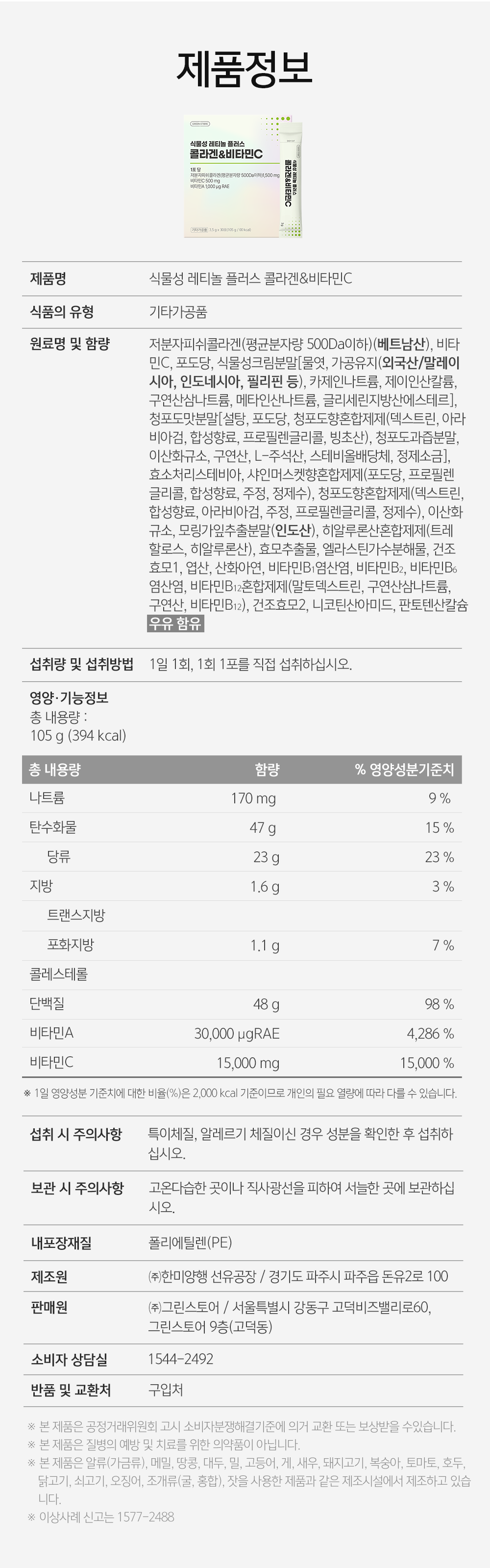 | 원료명 및 함량 | 저분자피쉬콜라겐(평균분자량 500Da이하)(베트남산), 포도당,비타민C, 식물성크림분말[물엿, 가공유지(외국산/말레이시아, 인도네시아,필리핀 등), 카제인나트륨, 제이인산칼륨, 구연산삼나트륨, 메타인산나트륨,글리세린지방산에스테르], 청포도맛분말(설탕, 포도당, 청포도향, 청포도과즙분말, 이산화규소, 구연산, L-주석산, 스테비올배당체, 정제소금), 효소처 리스테비아, 샤인머스켓향혼합제제(포도당, 프로필렌글리콜, 합성향료, 주정,정제수), 청포도향혼합제제(덱스트린, 합성향료, 아라비아검, 주정, 프로필렌글리콜, 정제수), 이산화규소, 모링가잎추출분말, 히알루론산혼합제제(트레할로스, 히알루론산), 효모추출물, 엘라스틴가수분해물, 건조효모, 엽산,산화아연, 비타민B1염산염, 비타민B2, 비타민B6염산염, 비타민B12혼합제제(말토덱스트린, 구연산삼나트륨, 구연산, 비타민B12), 식용건조효모, 니코틴산아미드, 판토텐산칼슘 우유 함유 |
